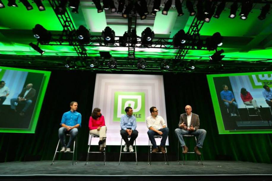 Bret Taylor (Quip), Selina Tobaccowala (SurveyMonkey), Thuan Pham (Uber), and Mike Krieger (Instagram) discuss scale issues in the keynote panel, moderated by Cade Metz (Wired).