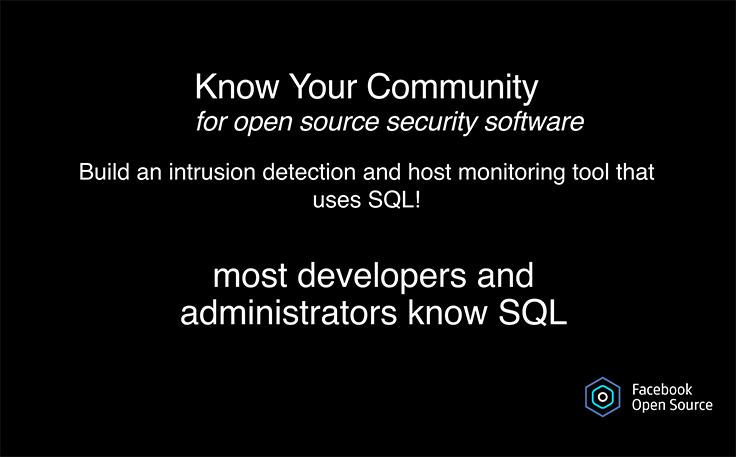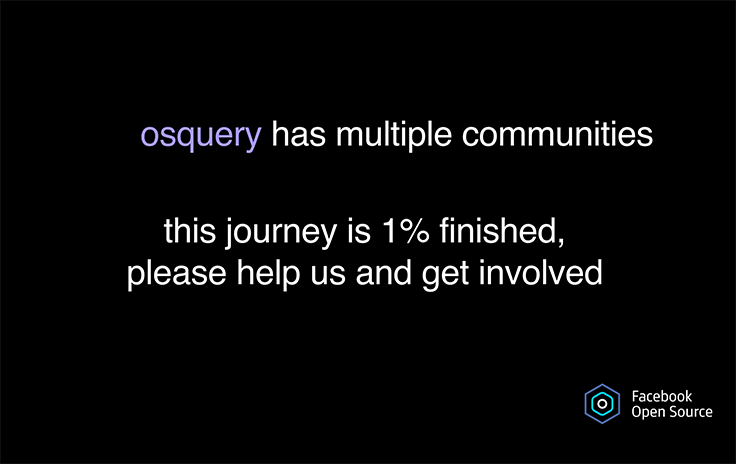 With osquery, we committed to providing fresh documentation and samples as much as possible. In fact, the entire project is engineered right in GitHub so people can see exactly what we’re doing. We also discovered the importance of mentoring osquery contributors, because many of them don’t publicly share their experience with our project.