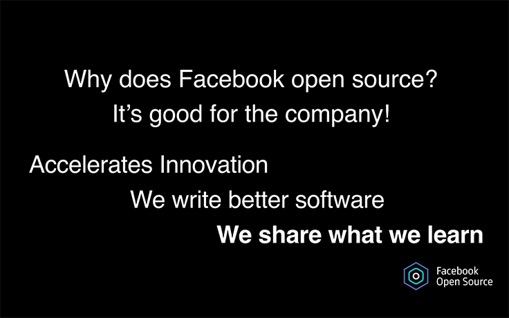 Facebook supports open source projects for the good of the company — it enables us to accelerate innovation, write better software, and share what we learn with others. Open collaboration helps build a project and collectively helps it grow.