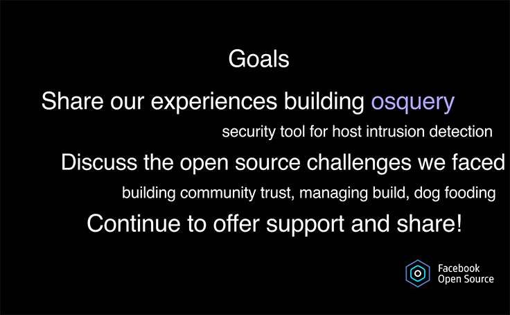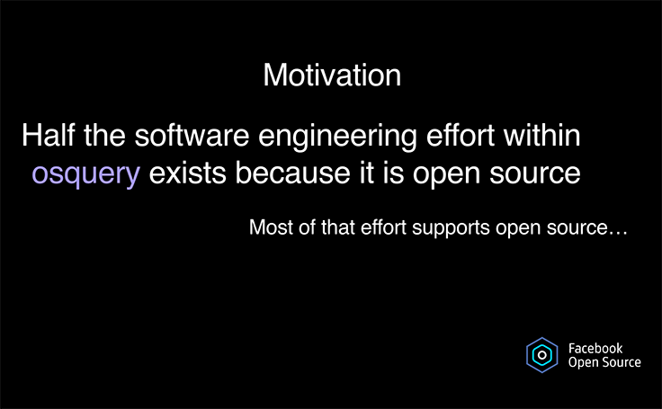 The traditional OSS community audience includes developers and end users, so we focused on deployment experience with osquery. However, we found that people using osquery preferred forking and maintaining internal additions, so the build tooling needs to be tailored for private repos.