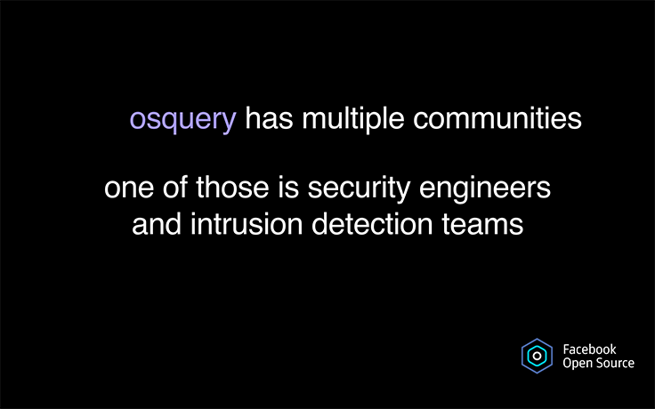 Outside Facebook, osquery grew from an immeasurable amount of support from the Mac and Linux security communities. As a result of all this support and community engagement, osquery is now the highest-rated security project on GitHub, and the community is organically organizing the first osquery user forum in November.