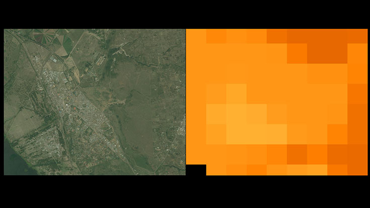 DigitalGlobe satellite image of Naivasha, Kenya (left) and gridded population of the world v4 from CIESIN at Columbia University (right).