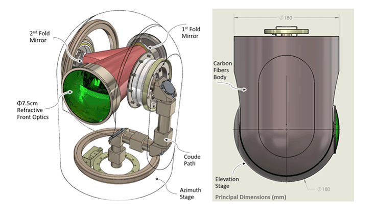 The second configuration for consideration was an air-to-air or air-to-ground capable, elevation over azimuth spherical gimbal with a refractive telescope folded twice, and a three mirrors long-legs Coude (elbo-type) path fixed to the azimuth stage. The optical bench is situated in the stationary base.