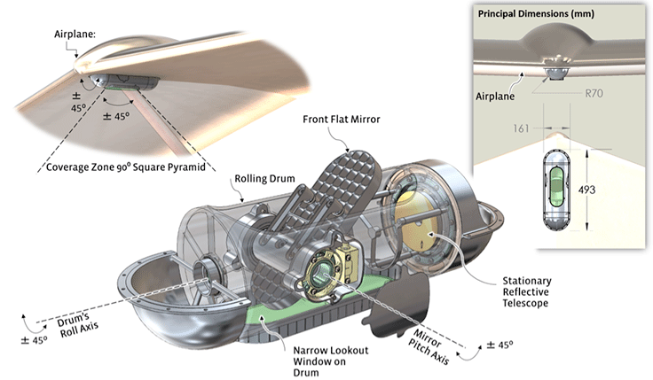 The initial configuration for consideration was an air-to-ground gimbal system with a stationary reflective telescope and two-axis motorized flat mirror in front of its aperture.