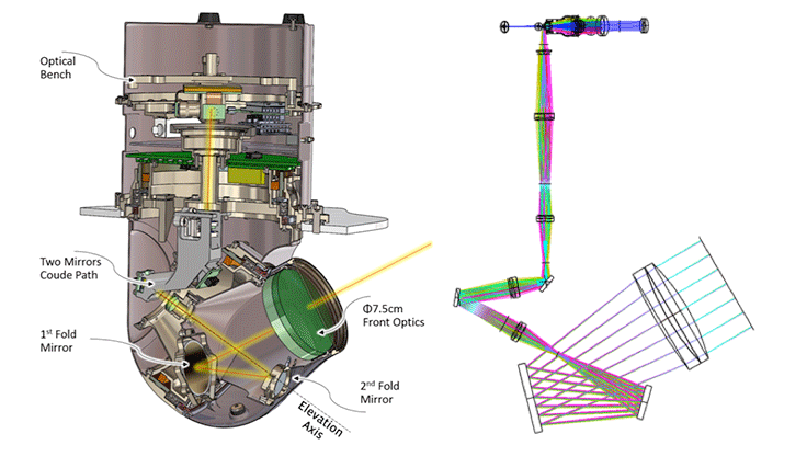 This section view of the gimbal demonstrates the inner optical train and the modularity of the optical bench and the Coude path to be fitted differently for different missions.