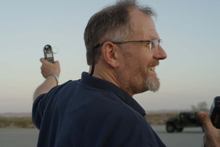 Andy Cox, chief aeronautical engineer, checking wind speed. ◂ ▸