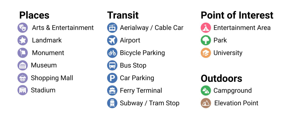Our initial basemaps eschewed icons. When we first introduced maps, a number of our use cases inserted contextual icons, like restaurants, into the map at the client level, so we did not include icons or labels for similar features. Since then, the variety of use cases has grown, and how the map is used across Meta has changed. Recently, we introduced iconography for parks, universities, and entertainment features like amusement parks and zoos. We also amended our existing icons for airports and train stations so that they fit with the new theme.