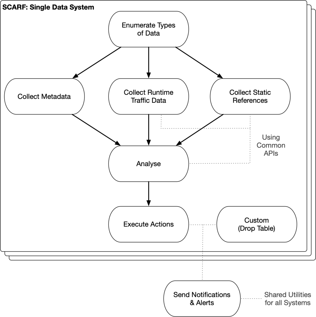 SCARF implements an unused data type cleanup system for Meta engineers to leverage when they want to ensure consistent removal of unused data. SCARF scans data systems to identify each type of data stored (for example, identifying all the tables in a relational database) and, for each of these, determines whether the data is being used. If any of the assets are not in use, SCARF initiates a process to safely remove them.