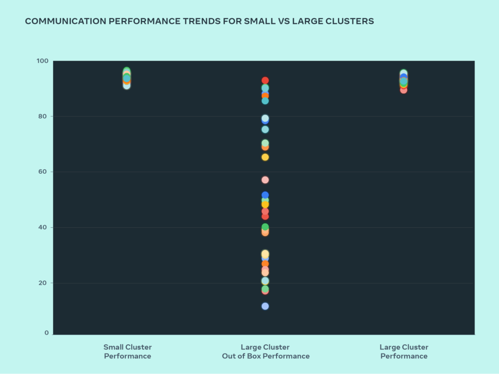 Our out-of-box performance for large clusters was initially poor and inconsistent, compared to optimized small cluster performance. To address this we made several changes to how our internal job scheduler schedules jobs with network topology awareness – this resulted in latency benefits and minimized the amount of traffic going to upper layers of the network. We also optimized our network routing strategy in combination with NVIDIA Collective Communications Library (NCCL) changes to achieve optimal network utilization. This helped push our large clusters to achieve great and expected performance just as our small clusters.