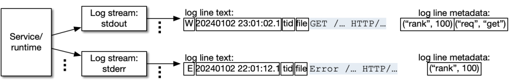 Logarithm represents logs as a named log stream of (host-local) time-ordered sequences of immutable unstructured text, corresponding to a single log file. A process can emit multiple log streams (stdout, stderr, and custom log files). Each log line can have zero or more metadata key-value pairs attached to it. A common example of metadata is rank ID in machine learning (ML) training, when multiple sequences of log lines are multiplexed into a single log stream (e.g., in PyTorch).