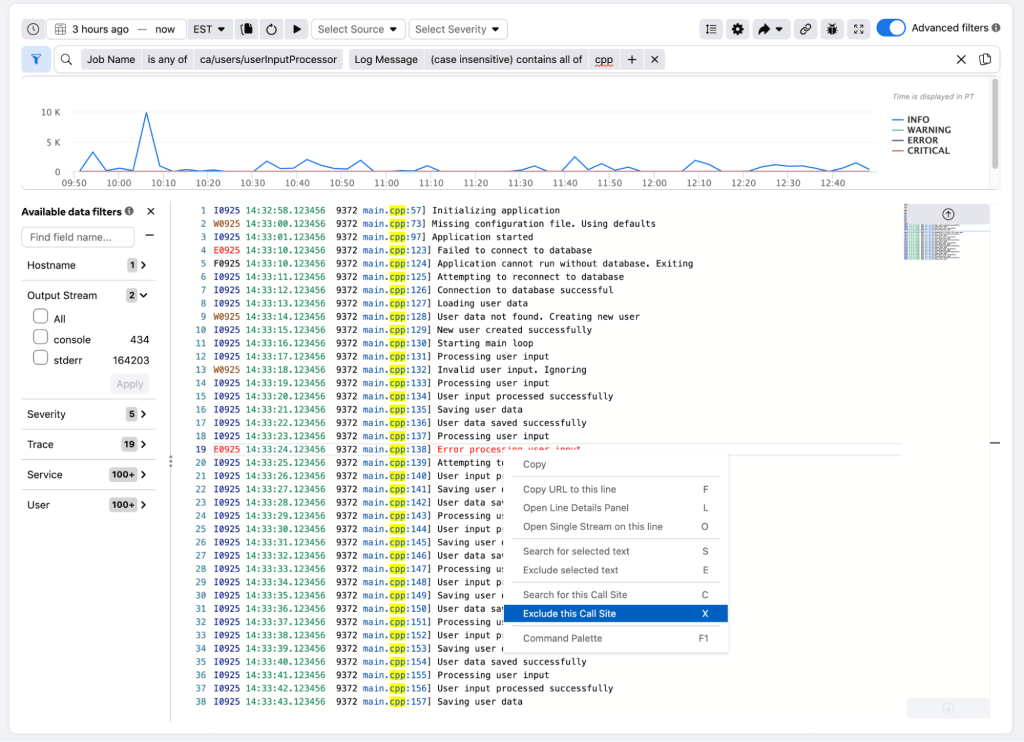 We added UI tools to enable common log-based interactive debugging primitives. The following figures show screenshots of two such features (on top of Logarithm’s filtering operations).