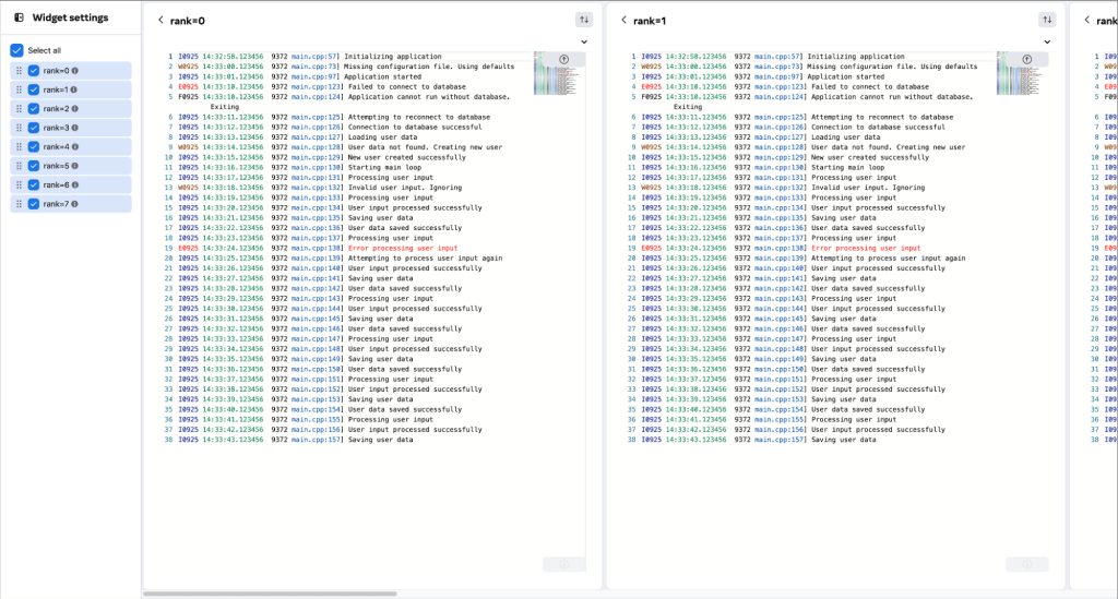 Filter–by-call site enables hiding known log lines or verbose/noisy logging sites when walking through a log stream. Walking through multiple log streams side-by-side enables finding rank state that is different from other ranks (i.e., additional lines or missing lines), which typically is a symptom or root cause. This is directly a result of the single program, multiple data nature of production training jobs, where every rank iterates on data batches with the same code (with batch-level barriers).