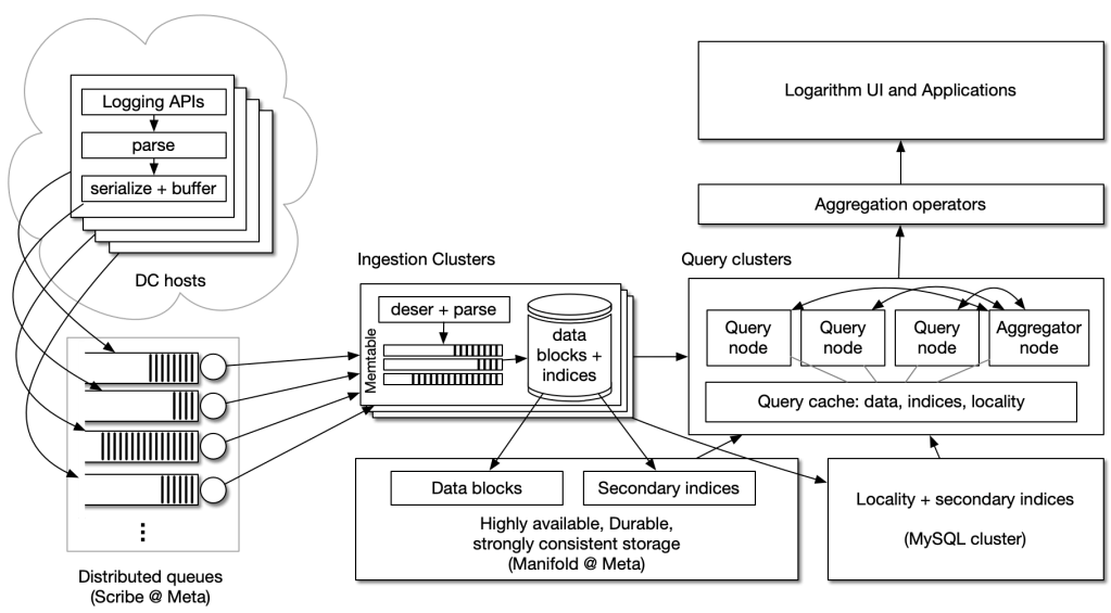 - Logarithm is a hosted, serverless, multitenant service, used only internally at Meta, that consumes and indexes these logs and provides an interactive query interface to retrieve and view logs.