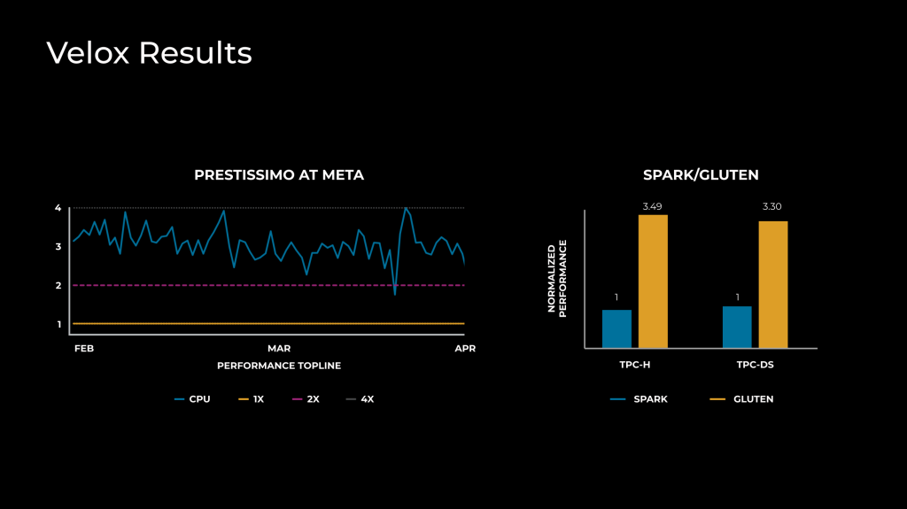 By being composable, Velox enabled us to write and maintain this complex logic once and then benefit from it multiple times. It also allowed us to build a more focused team of data execution specialists who were able to create a far more efficient execution component than what was possible with bespoke systems, due to investment fragmentation. By being open source, Velox allowed us to collaborate with the community while building these features, and to more closely partner with hardware vendors to ensure better integration with evolving hardware platforms.