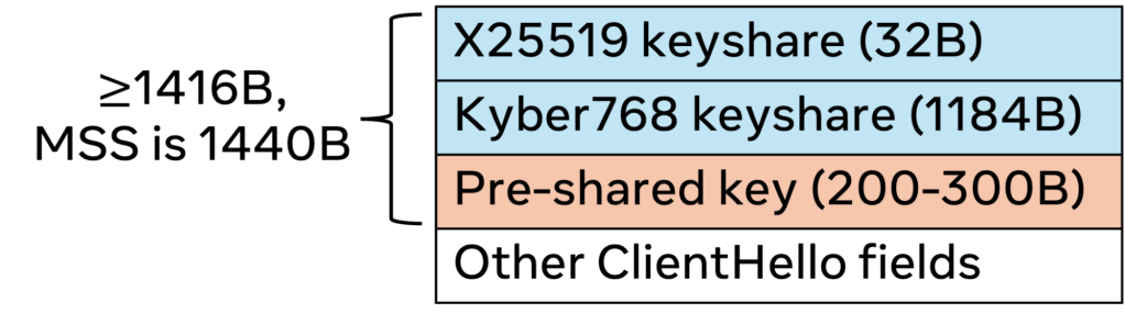 However, the key size becomes an issue during TLS resumption. Internally, we do Ephemeral Diffie-Hellman key exchange to achieve forward secrecy, so key exchange still happens on resumption. There will also be a pre-shared key (PSK) for authentication. These PSKs are 200-300 bytes long, and the remaining ClientHello fields can run up to 200 bytes, causing the resumption ClientHello to exceed the MSS for one packet.