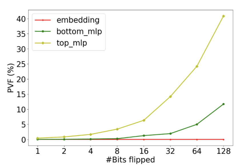 Figure 3 illustrates the PVF of three DLRM parameter components, embedding table, bot-MLP, and top-MLP, under 1, 2, 4, 8, 16, 32, 64, and 128 bit flips during each inference. We observe different vulnerability levels across different parts of DLRM. For example, under a single bit flip, the embedding table has relatively low PVF; this is attributed to embedding tables being highly sparse, and parameter corruptions are only activated when the particular corrupted parameter is activated by the corresponding sparse feature. However, top-MLP can have 0.4% under even a single bit flip. This is significant – for every 1000 inferences, four inferences will be incorrect. This highlights the importance of protecting specific vulnerable parameters for a given model based on the PVF measurement.