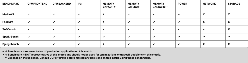 The graphic below shows areas of HW/SW design where we have seen DCPerf being representative of production usage and being beneficial for delivering relevant performance signals and help with optimizations as well as areas of future work.