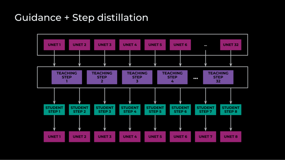 The fourth optimization we implemented combined guidance and step distillation. We accomplished step distillation by initializing a teacher and student with the same weights, and then trained the student to match multiple teacher steps in a single step. Guidance distillation, in contrast, refers to how diffusion models leverage a classifier-free guidance for conditional image generation. This requires both a conditional and unconditional forward pass for every solver step.