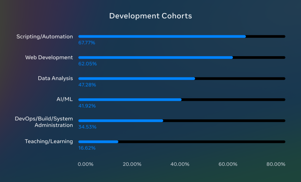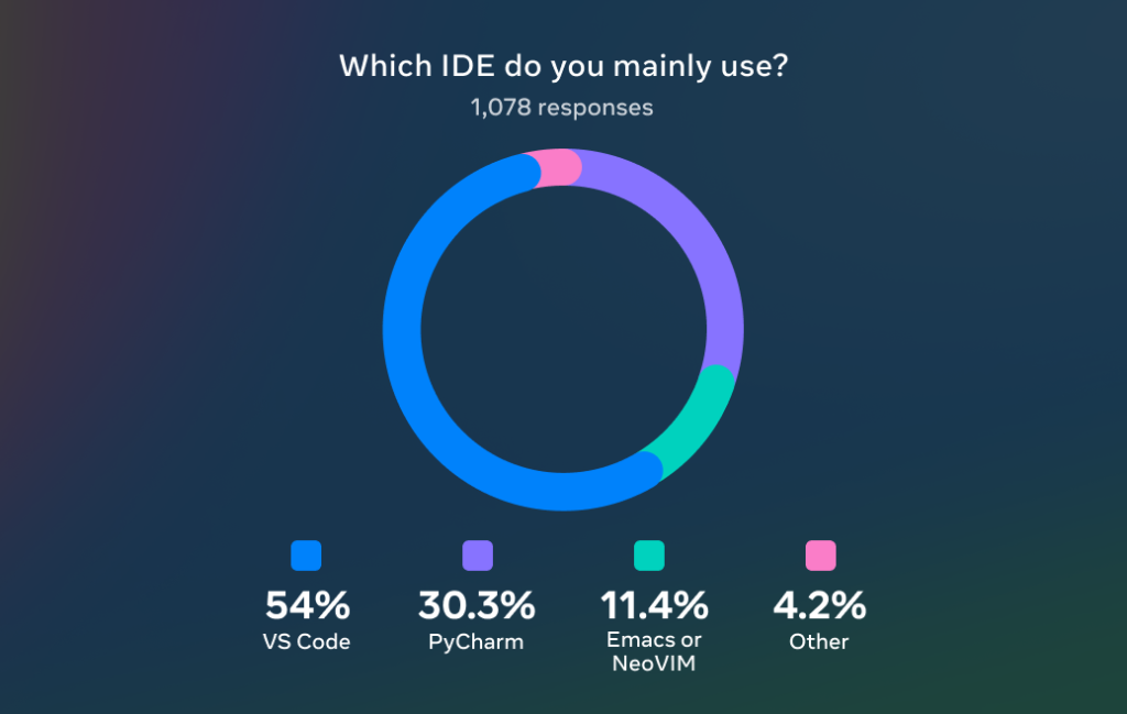 *Based on an online survey conducted among 1,083 people distributed through X, LinkedIn, Reddit,and other social media platforms for targeting Python developers. The research was conducted by Meta, Microsoft and JetBrains. Data was collected between 07/29/2024 and 10/08/2024.
