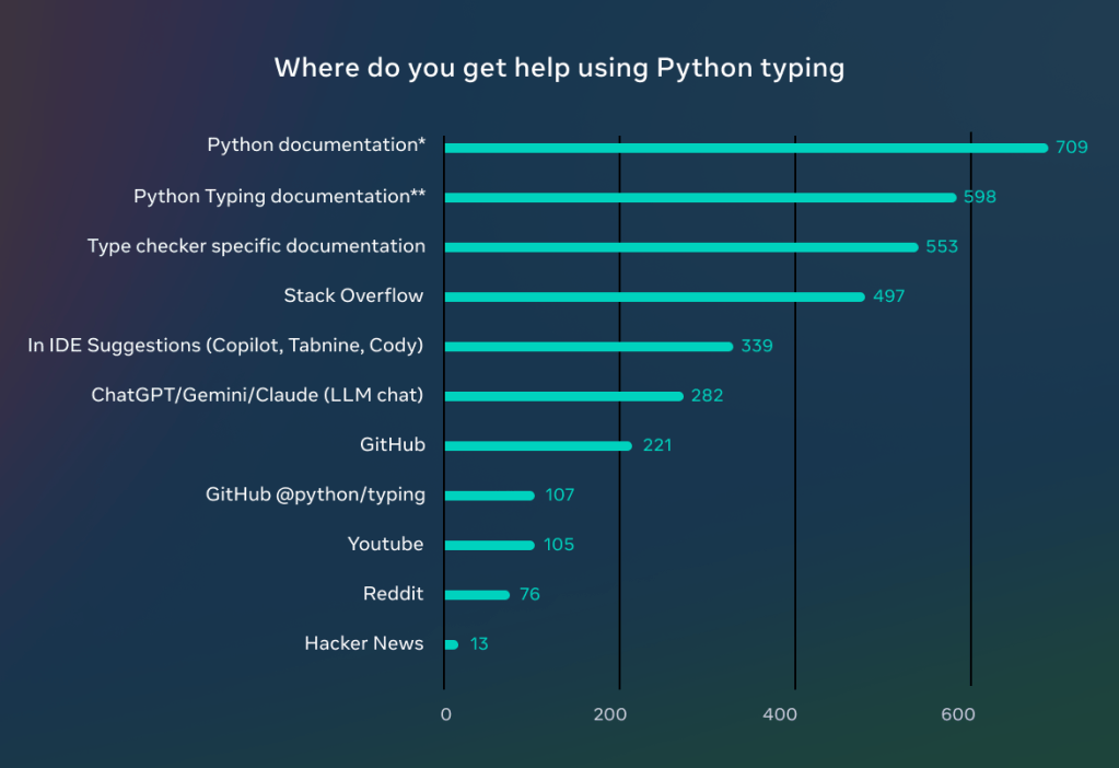Developers are asking for better standardization and consistency across tools. Improving support for dynamic and complex patterns, as well as enhancing runtime type checking, are all key areas for further thought. Better type checker performance was a common pain point cited by developers in all cohorts. Beyond features and performance, the accessibility and discoverability of Python documentation was mentioned numerous times. The Python 3 typing docs were the most popular way for people to learn about types or get help with issues. There was consistent feedback asking for better documentation, particularly for advanced typing features that included examples. “Lack of familiarity” was the second highest reason (8% of all responses) people are not using types. There is an opportunity to improve discoverability and usability of documentation.