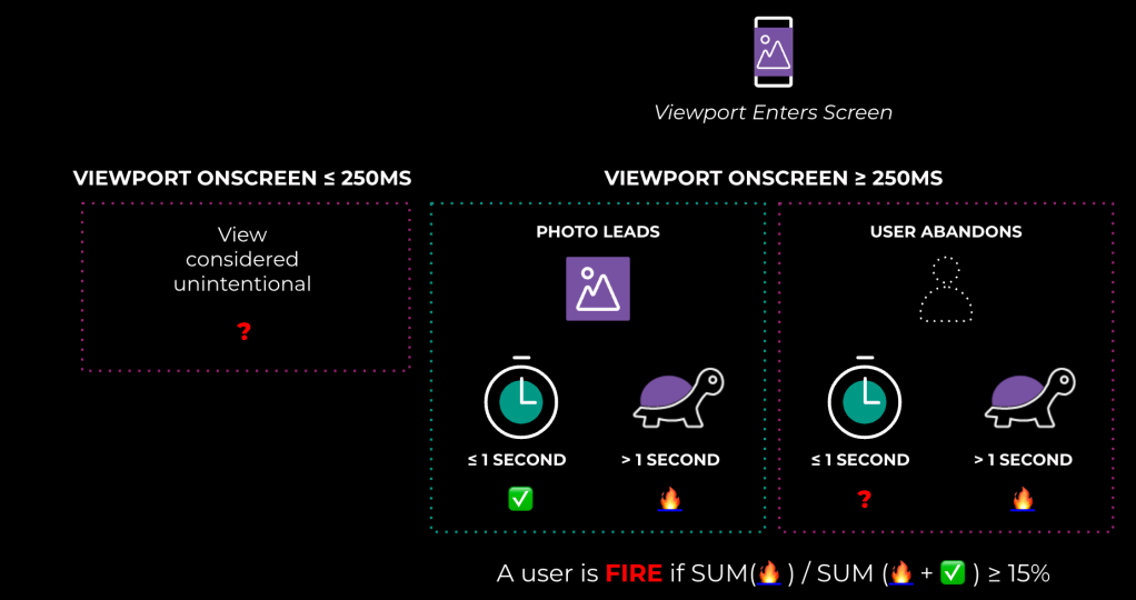 In addition to all the text updates people share, we have a lot of photos shared on Threads. When images load slowly or not at all, that can cause someone to stop using the app. That’s why we monitor an important metric to alert when there’s a regression in how images are loading for our users. That metric, %FIRE, is the percentage of people who experience a frustrating image-render experience, and it’s calculated as shown in Figure 1, below.