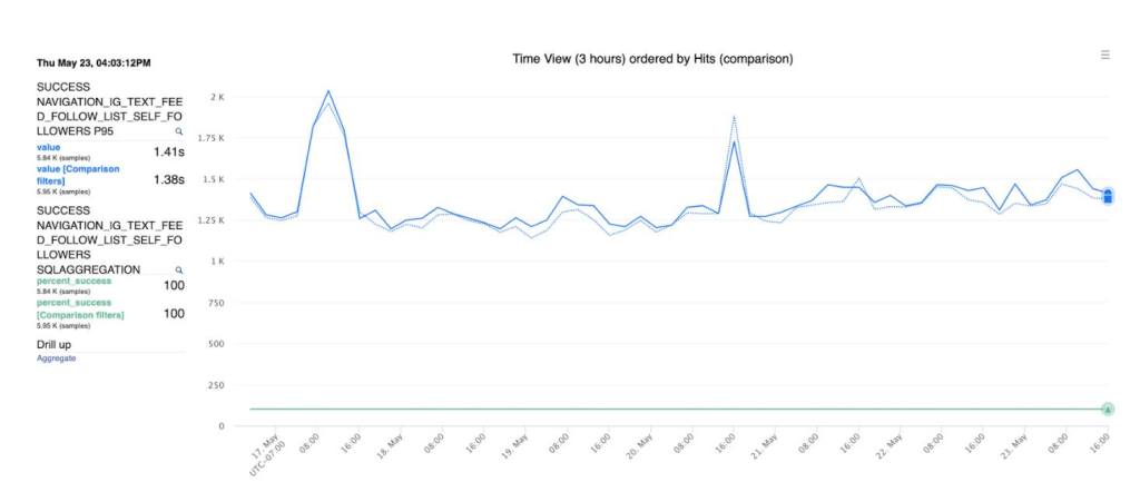 Below is an example graph of the latency data (p95) for when a user views the list of their followers. The blue line compares the REST and GraphQL latency data, which are very similar. We saw similar results across all the different views, which gave the Threads iOS team confidence to adopt GraphQL for all new endpoints.
