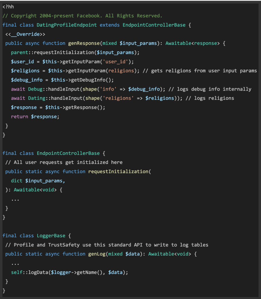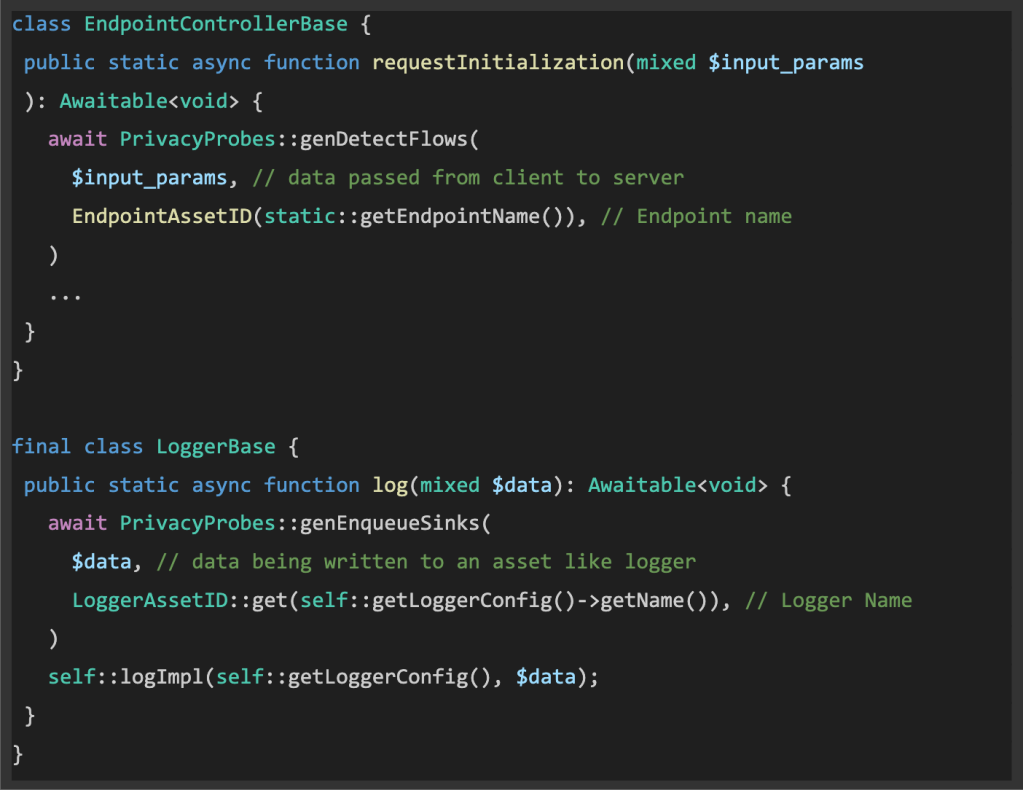 We have instrumented Meta’s core data frameworks and libraries at both the data origin points (sources) and their eventual outputs (sinks), such as logging framework, which allows for comprehensive data flow tracking. This approach is exemplified in the following code snippet: