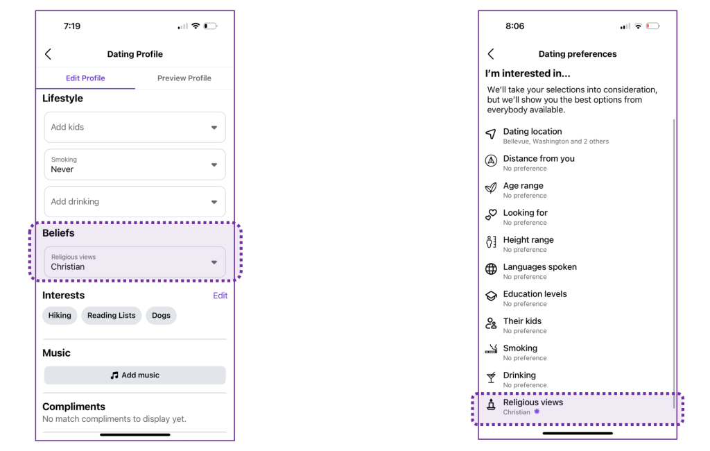 When setting up a profile on the Facebook Dating app, people can populate their religious views. This information is then utilized to identify relevant matches with other people who have specified matched values in their dating preferences. On Dating, religious views are subject to purpose limitation requirements, for example, they will not be used to personalize experiences on other Facebook Products.