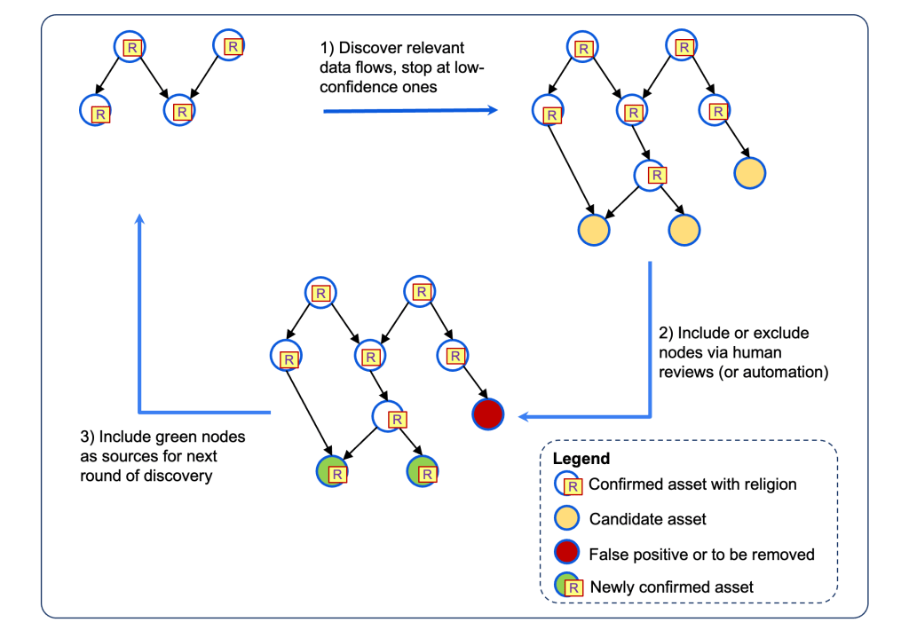 Now that we have the lineage graph at our disposal, how can we effectively distill a subset of data flows pertinent to a specific privacy requirement for religion data? To address this question, we have developed an iterative analysis tool that enables developers to pinpoint precise data flows and systematically filter out irrelevant ones. The tool kicks off a repetitive discovery process aided by the lineage graph and privacy controls from Policy Zones, to narrow down the most relevant flows. This refined data allows developers to make a final determination about the flows they would like to use, producing an optimal path for traversing the lineage graph. The following are the major steps involved, captured holistically in the diagram, below: