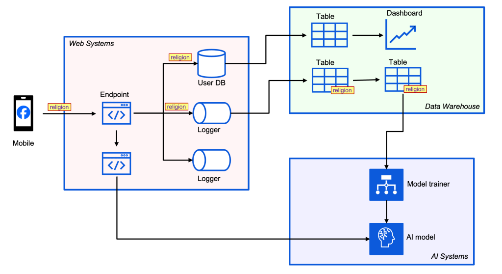 In this blog, we will delve into an early stage in PAI implementation: data lineage. Data lineage refers to the process of tracing the journey of data as it moves through various systems, illustrating how data transitions from one data asset, such as a database table (the source asset), to another (the sink asset). We’ll also walk through how we track the lineage of users’ “religion” information in our Facebook Dating app.
