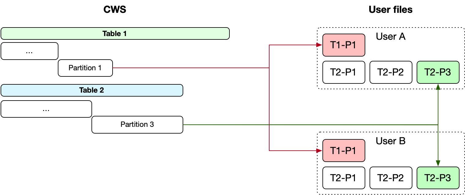 A diagram showing that the processing of each partition splits the data into one file per user per partition. Both users A and B will have a file representing Table 1 Partition 1, and so on.