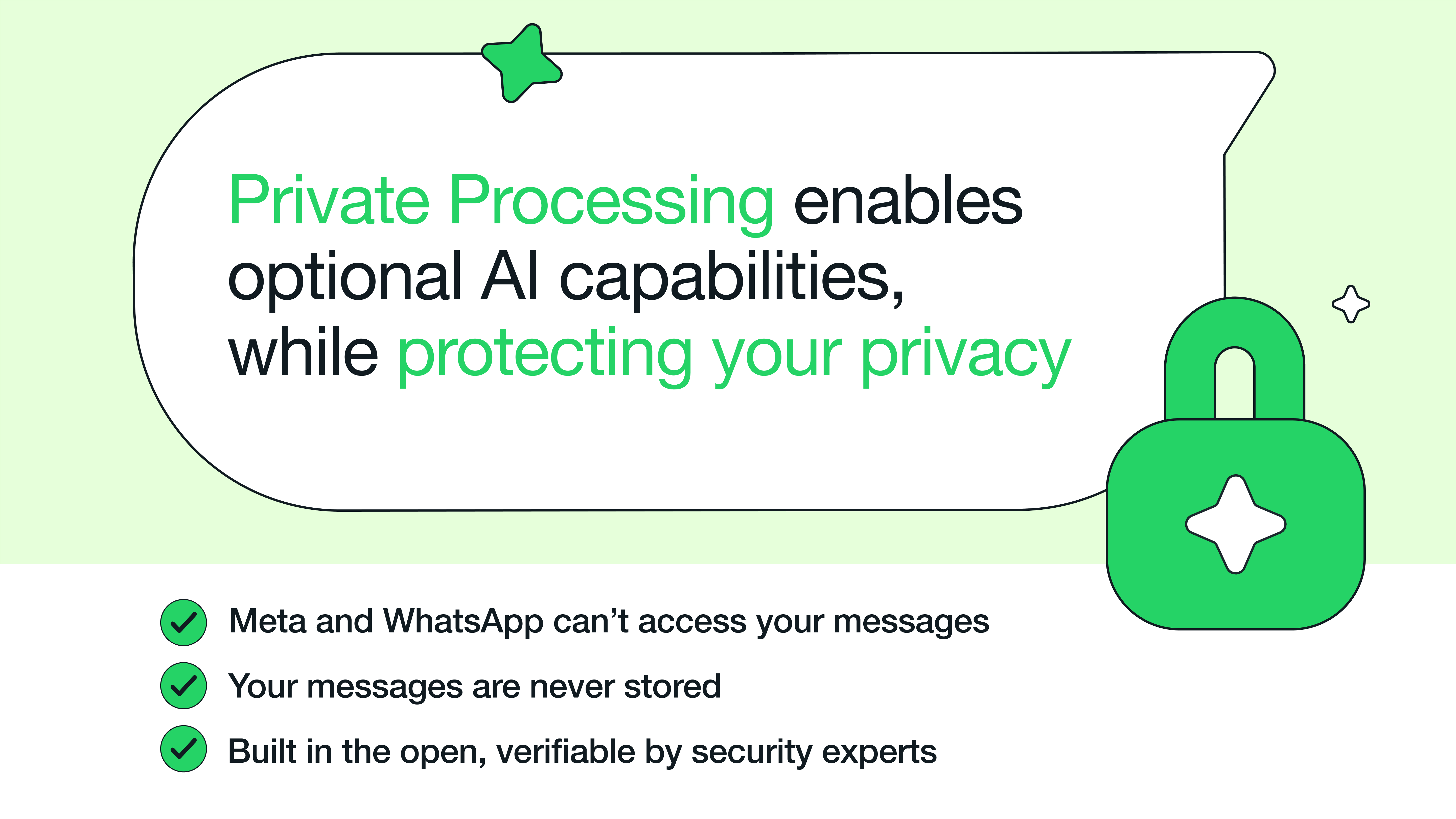 - We’re sharing an early look into Private Processing, an optional capability that enables users to initiate a request to a confidential and secure environment and use AI for processing messages where no one — including Meta and WhatsApp — can access them.