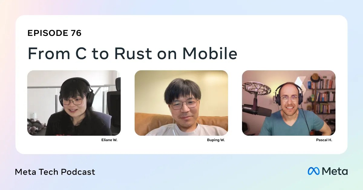 Pascal Hartig is joined on the latest Meta Tech Podcast by Elaine and Buping, two software engineers working on a bold project to rewrite the decades-old C code in one of Meta’s core messaging libraries in Rust. It’s an ambitious effort that will transform a central messaging library that is shared across Messenger, Facebook, Instagram, and Meta’s AR/VR platforms.
