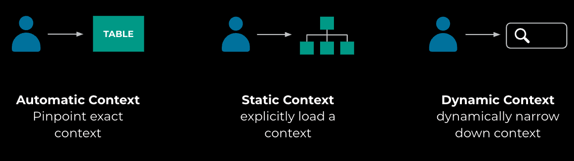 In addition to organizing inputs for agents to use, another crucial aspect is context management. Here, we differentiate among three scenarios, as shown below in Figure 8. The first scenario is called “automatic context.” Imagine data users discovering data they want to access, only to find their access blocked by controls. The system is aware of who is trying to access what, allowing the agent to fetch the exact context. The second scenario is “static context.” This occurs when users choose to focus on a specific scope explicitly or expand the resource from an automatic context to a broader one. The last scenario is “dynamic context.” It allows agents to further filter resources by metadata, such as data semantics, or via similarity search.