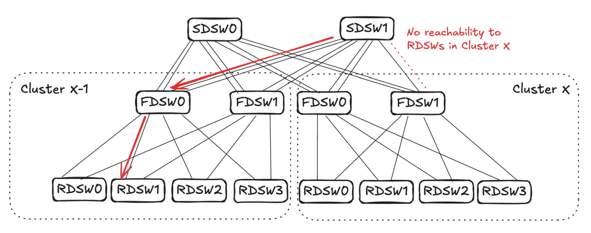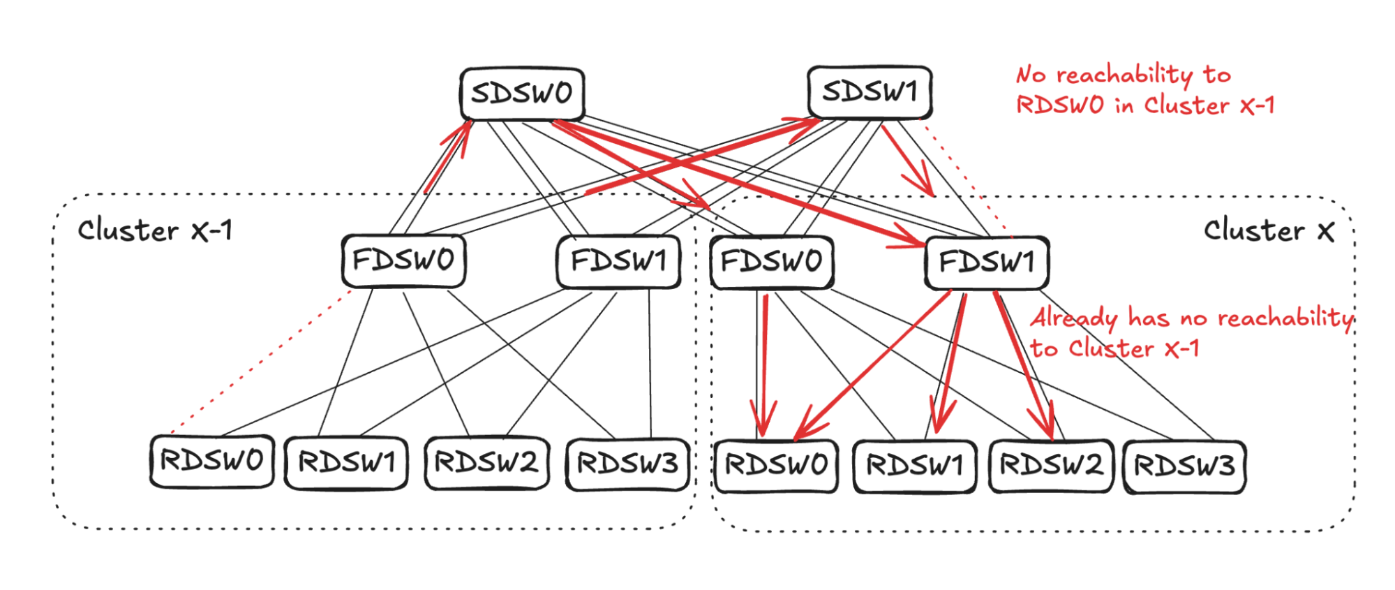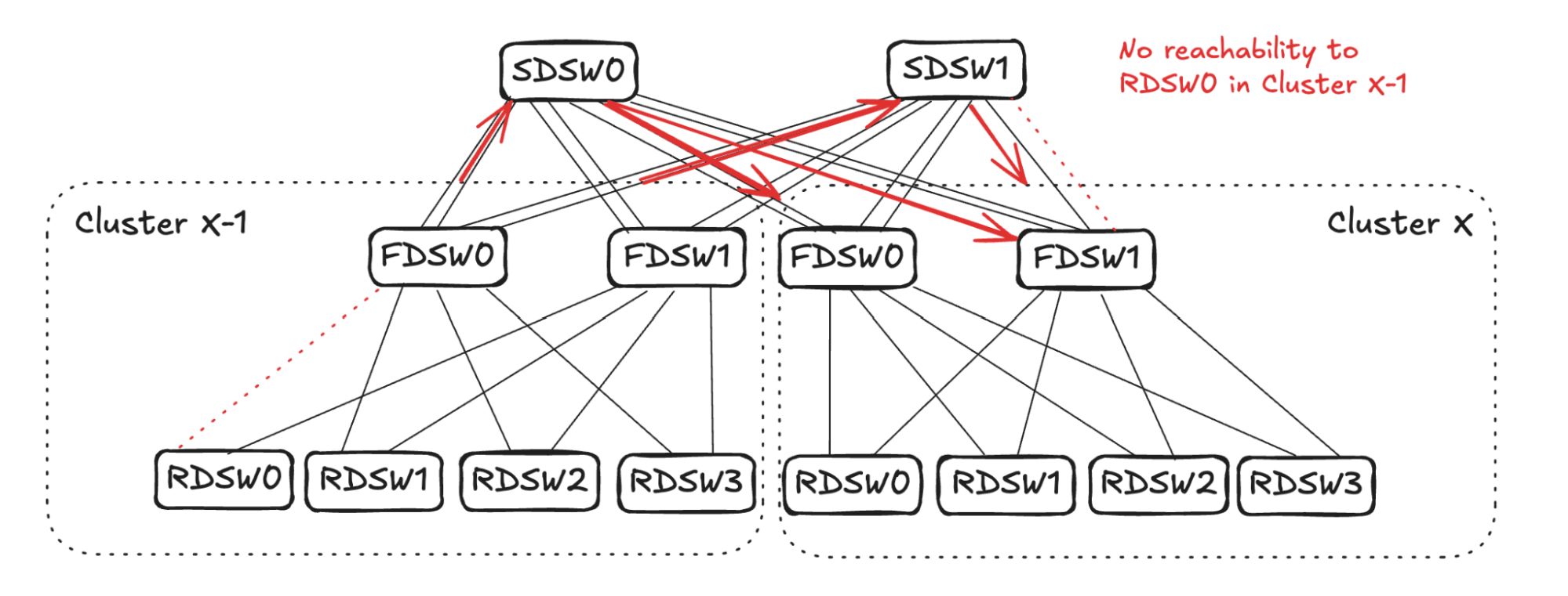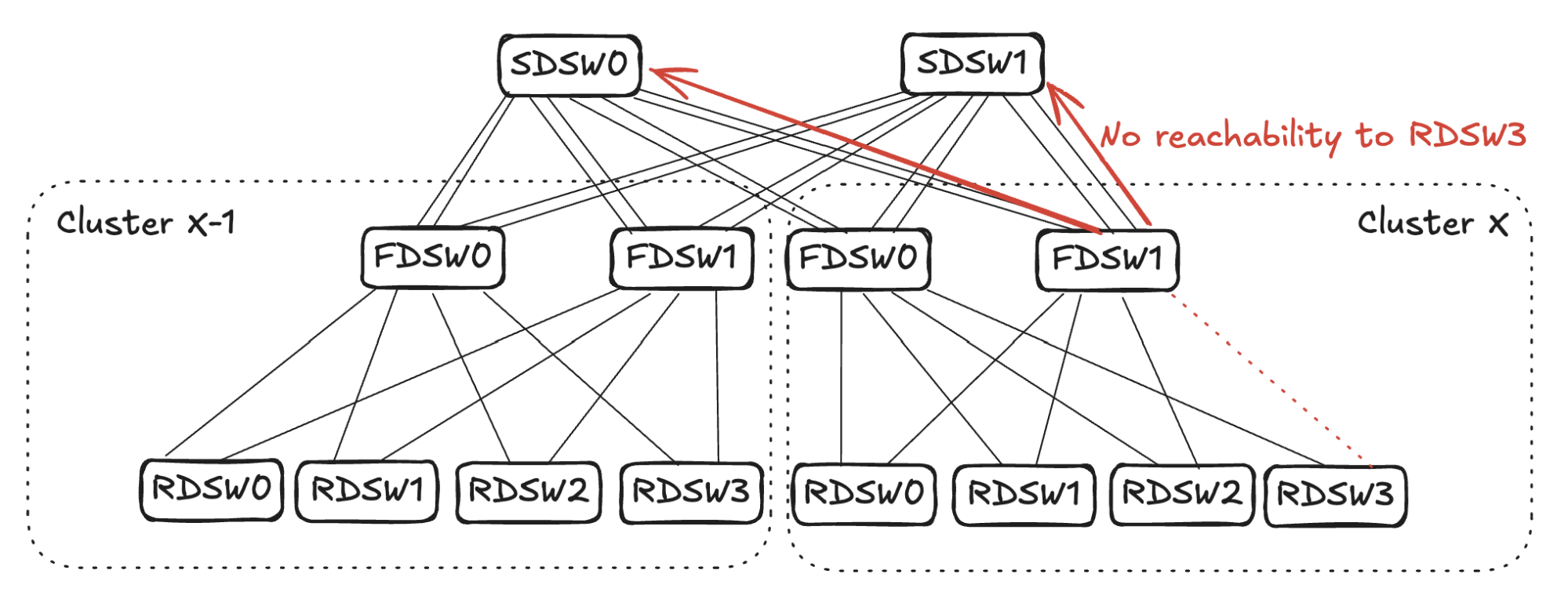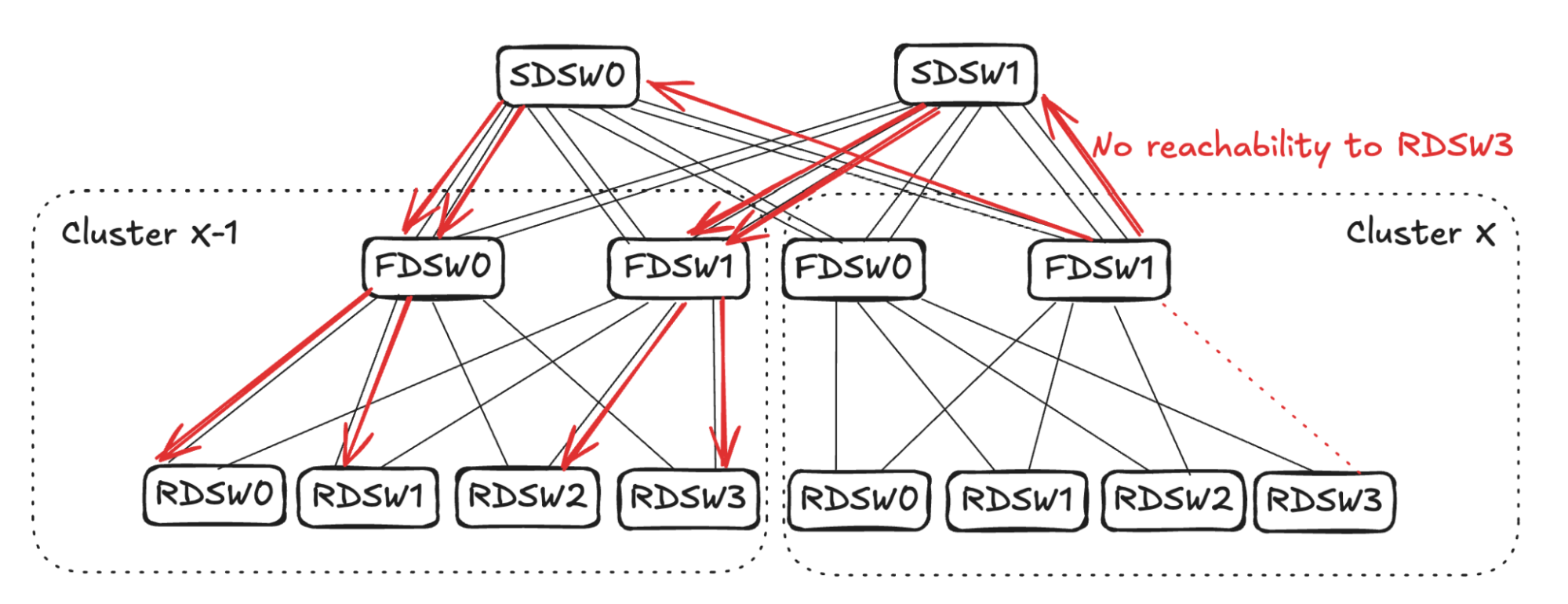 Assume Cluster X FDSW1 randomly picks the link to RDSW2. It will stop advertising reachability to all RDSWs in Cluster X-1. Note that the same link can still be utilized for intra-cluster traffic, as it has full reachability to RDSWs in Cluster X.