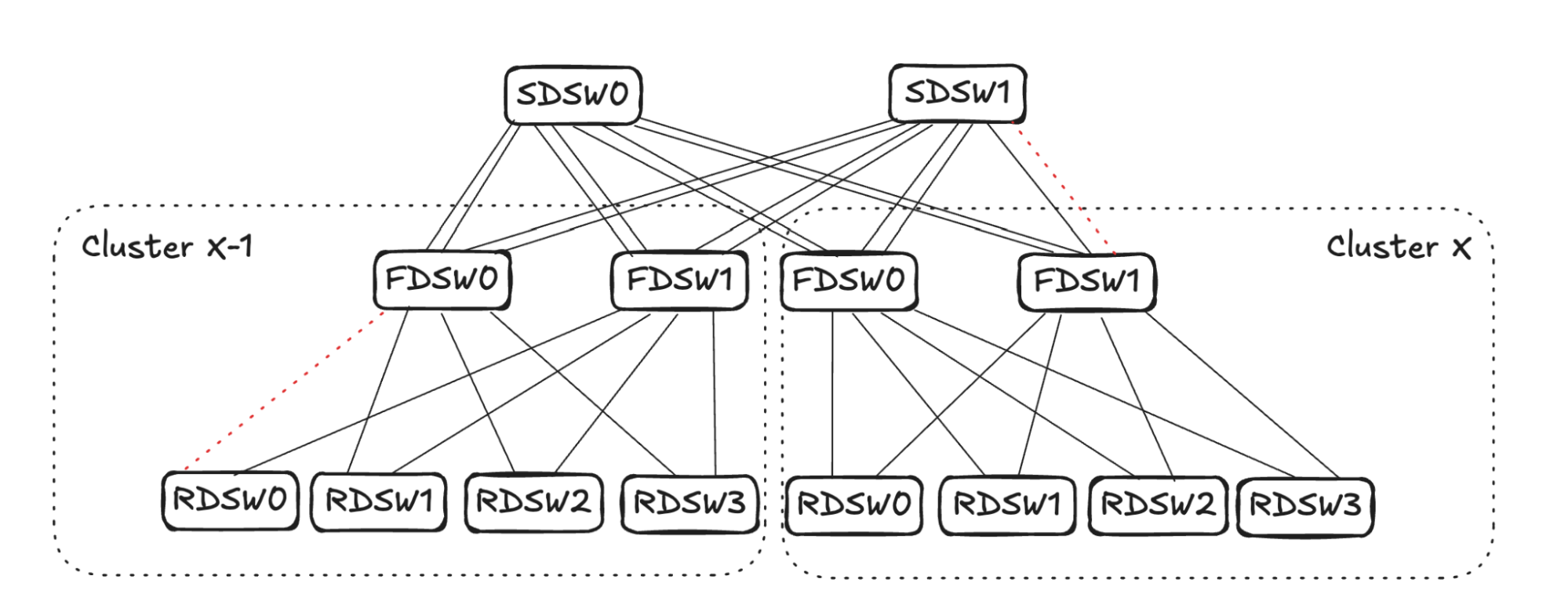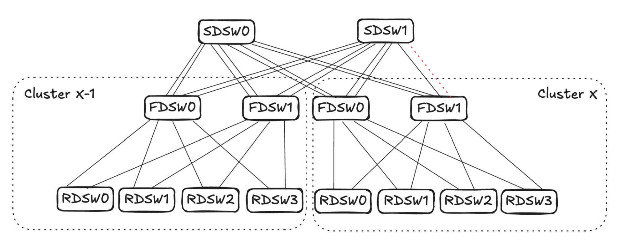 In the case of RDSW<->FDSW link failure, RDSW will lose connectivity to the FDSW, hence losing both input and output capacity on the link. FDSW also loses connectivity to the RDSW and then stops advertising the connectivity. In Figure 5 (below) FDSW1 in Cluster X loses connection to RDSW3, hence it stops advertising reachability to SDSW0 and SDSW1.