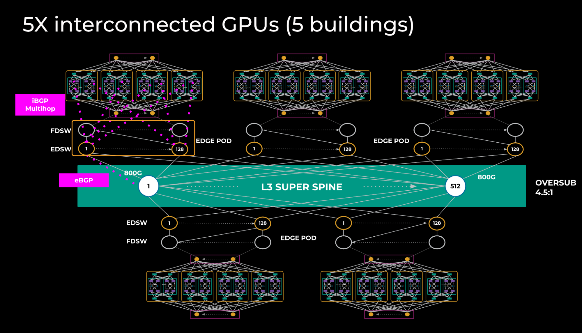 To achieve a larger interconnected GPU scale, we connected 5x DSF L2 zones via the L3 super-spine layer. (See Figure 3 below.) We did this by using a special edge point of delivery (PoD) in each of the buildings. Edge PoDs consist of 40 FDSWs and 128 edge DSF switches (EDSWs). From a hardware point of view, EDSW is the same as RDSW but differs in its function of providing connectivity to the L3 super spine.