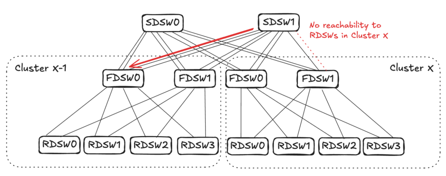 Figure 10: SDSW1 stops advertising reachability to FDSW0 in Cluster X-1.