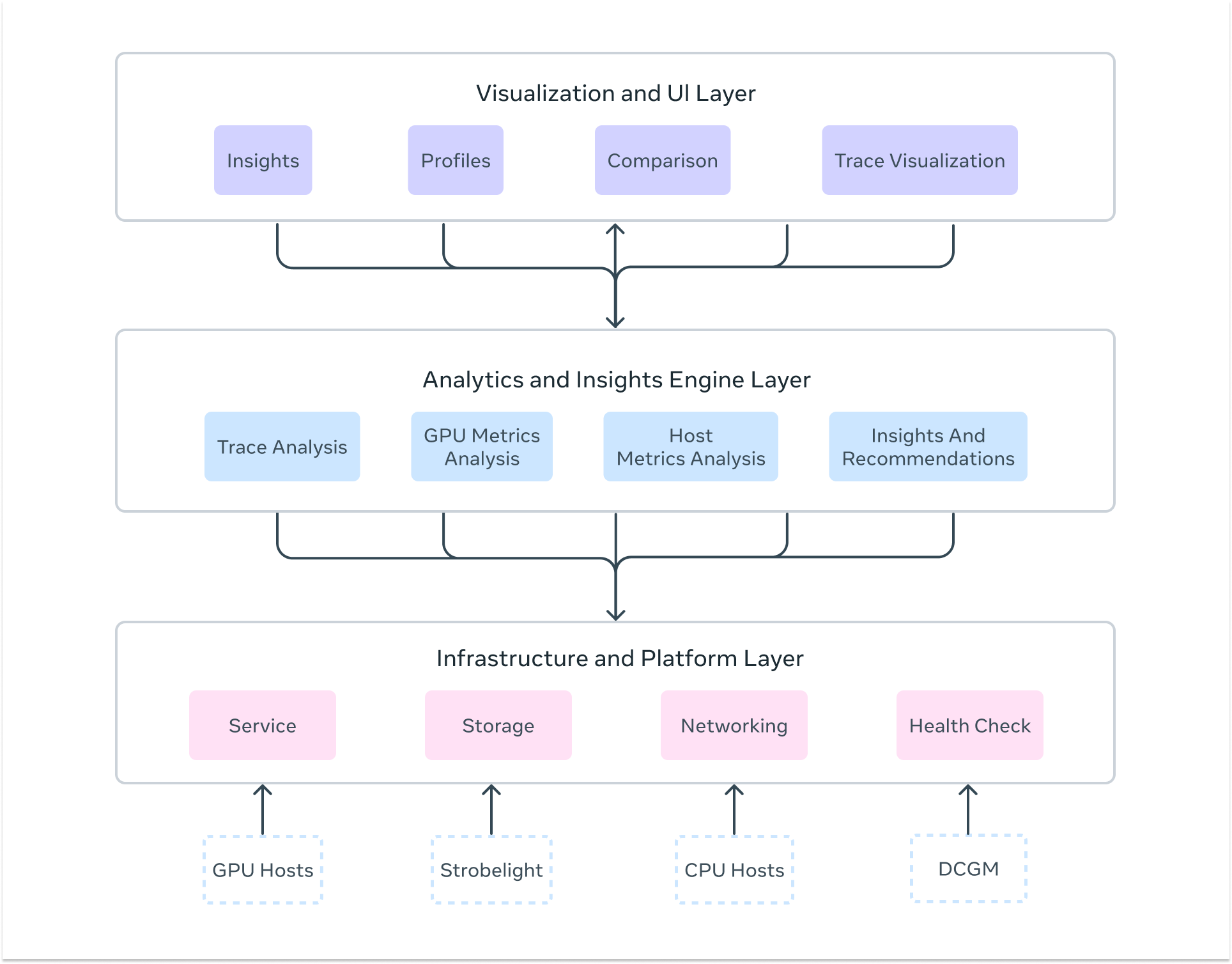 The core intelligence layer delivers deep analytical capabilities through multiple specialized analyzers. This includes: GPU trace analysis via Kineto integration and NVIDIA DCGM, CPU profiling through StrobeLight integration, host-level metrics analysis via dyno telemetry, communication pattern analysis for distributed training, straggler detection across distributed ranks, memory allocation profiling (including GPU memory snooping), request/response profiling for inference workloads, and much more. The engine automatically detects performance anti-patterns and also provides actionable recommendations.