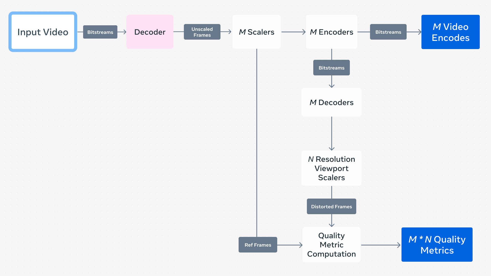 Meta executes ffmpeg (the main CLI application) and ffprobe (a utility for obtaining media file properties) binaries tens of billions of times a day, introducing unique challenges when dealing with media files. FFmpeg can easily perform transcoding and editing on individual files, but our workflows have additional requirements to meet our needs. For many years we had to rely on our own internally developed fork of FFmpeg to provide features that have only recently been added to FFmpeg, such as threaded multi-lane encoding and real-time quality metric computation.