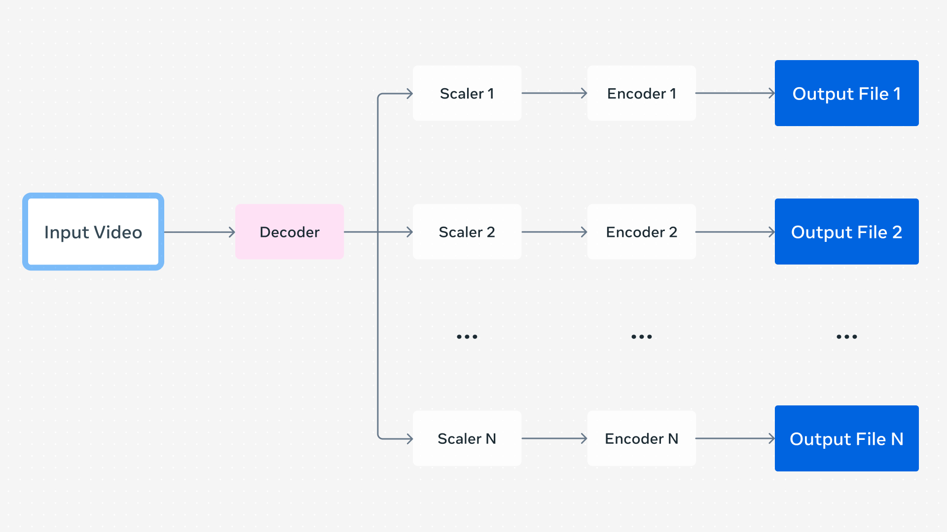 In a very simple system separate FFmpeg command lines can generate the encodings for each lane one-by-one in serial. This could be optimized by running each command in parallel, but this quickly becomes inefficient due to the duplicate work done by each process.